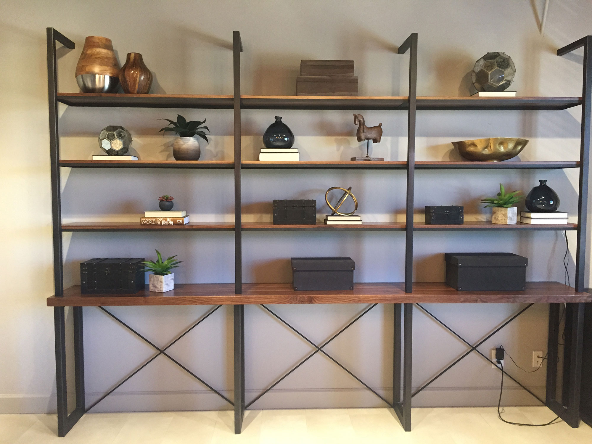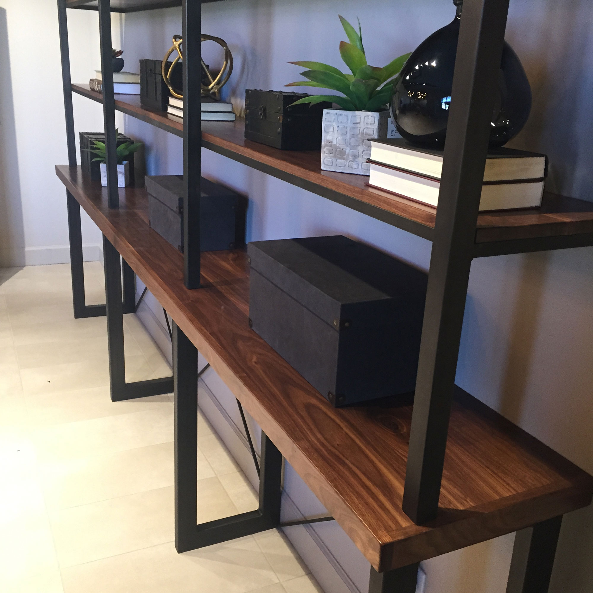 custom etagere steel walnut trestle shelving
